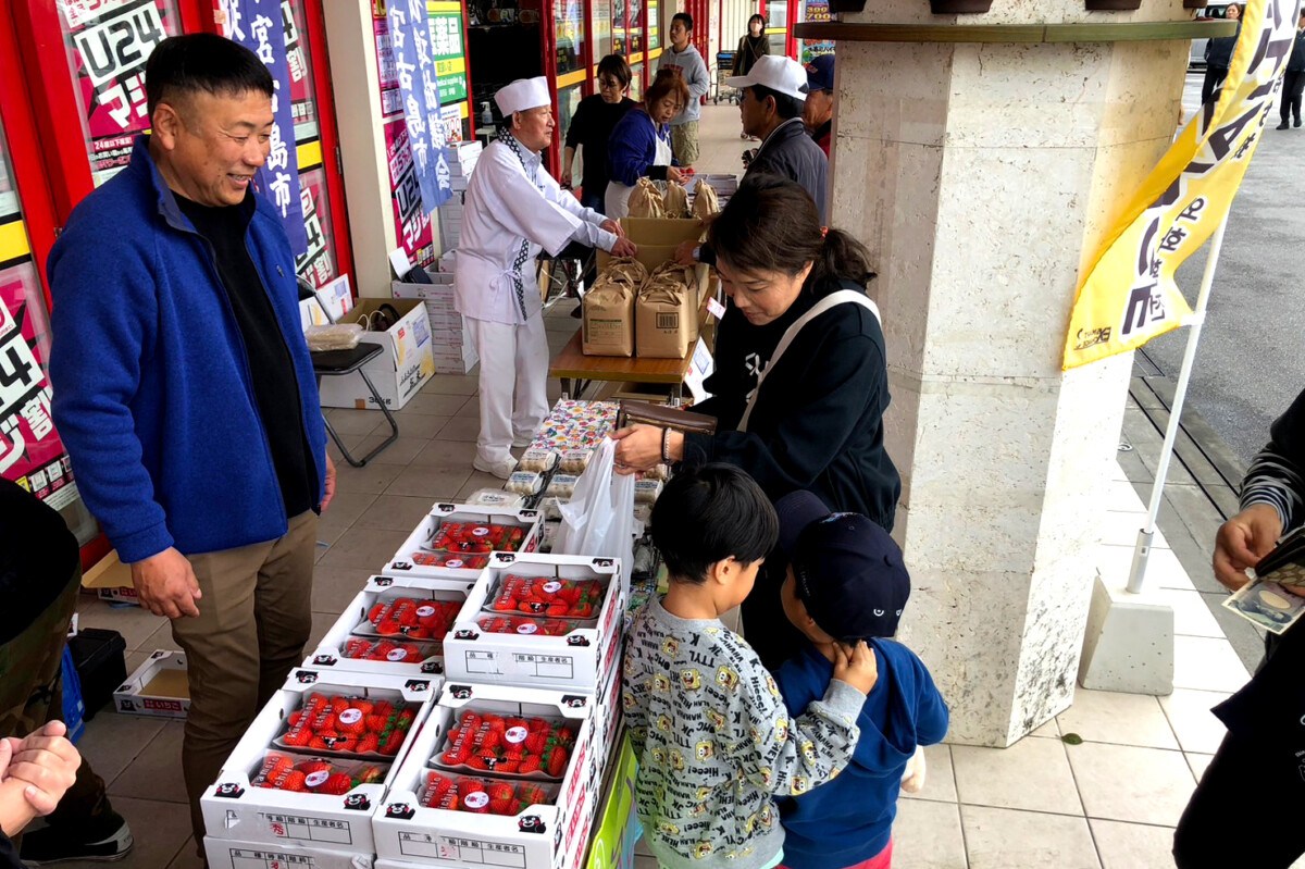 栃木県市貝町と熊本県山鹿市の両交流協議会による「いちごフェア合同物産展」が7日、ドン・キホーテ宮古島店で2日間の日程で始まった。初日は開始直後から多くの市民が詰めかけ、用意されたイチゴ100パックがわずか15分で完売するなど大盛況となった。同物産展はきょう8日も午前10時から正午まで開催され、完売必至のイチゴや特産品が販売される。