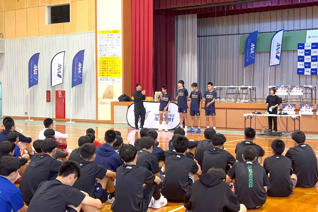 開会式でANA沖縄支店の河野辺朋広支店長は「沖縄の宝であるバスケットを通じて、地域に何かを残したいという思いで活動している。離島では機会が少ないので、技術だけでなく向き合う姿勢も学んでほしい」と激励。