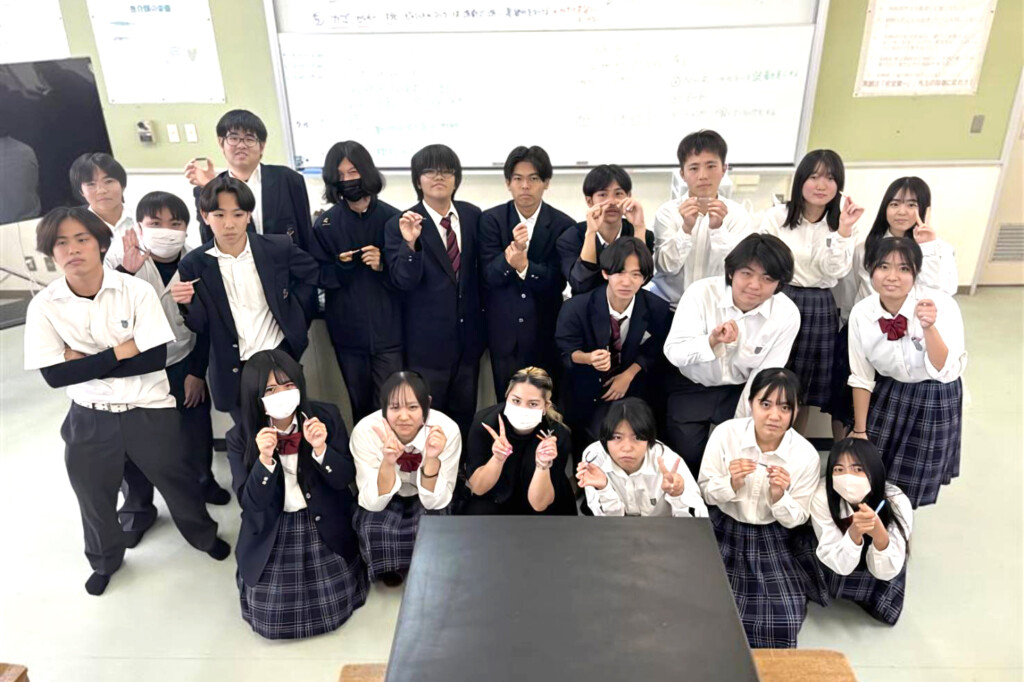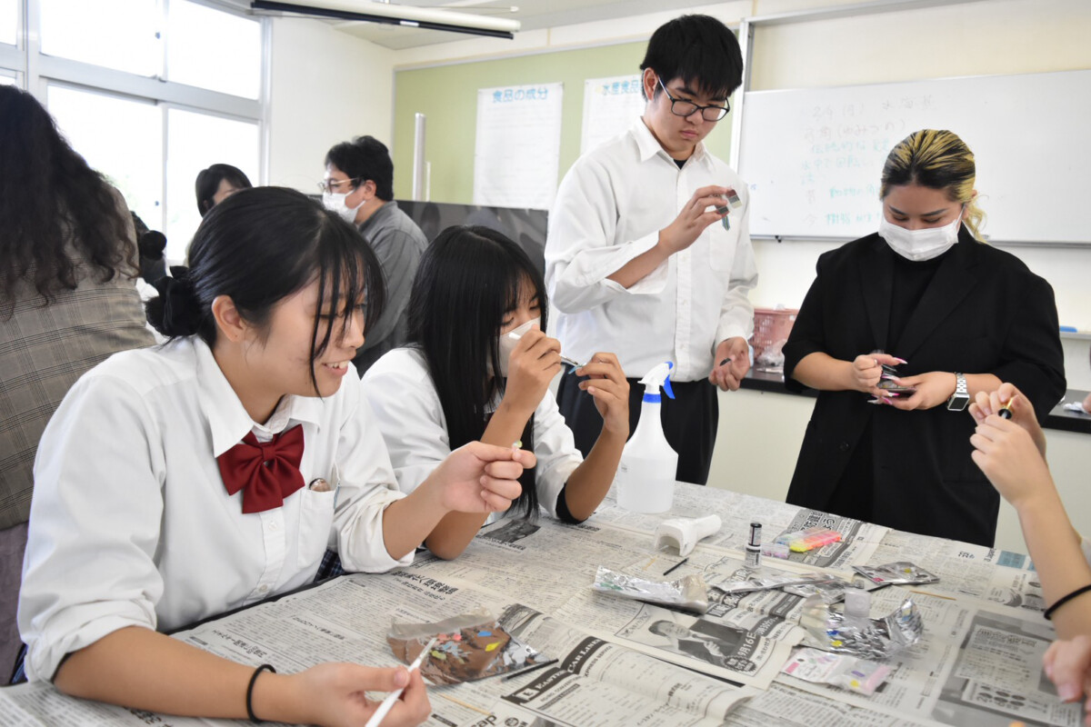 実習は、水産海洋基礎学習として実施。市内平良でジェルネイルサロン「Beauty Salon mare」を営む櫻井千紘さんを講師に迎えた。弓角はカツオやマグロの一本釣りで古くから使われてきた疑似餌の一種。かつて先島諸島では水牛の角や骨を材料に制作されていたが、現在は樹脂製が主流となっている。