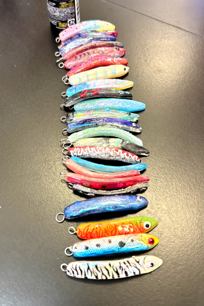 生徒たちは、櫻井さんの指導のもと、カラージェルやグリッター、ラメ入りジェルなどを樹脂製の弓角に塗布。海中での光の反射や、魚へのアピール力を意識しながら、自由な発想でデザインを施した。