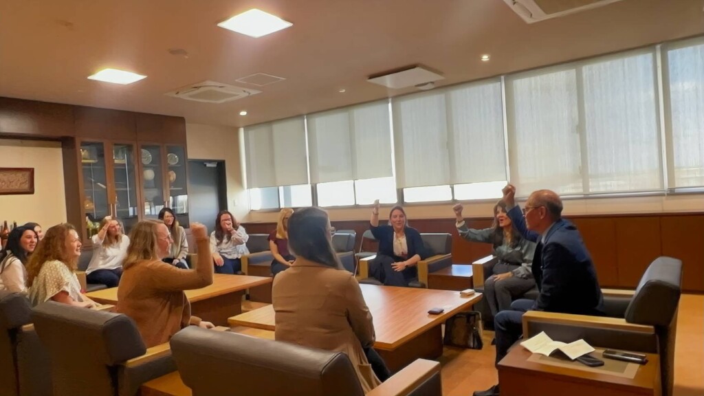 嘉数市長を表敬したシルビアさん(前列左から3人目)らAWWAの皆さん =12日、市役所・市長応接室