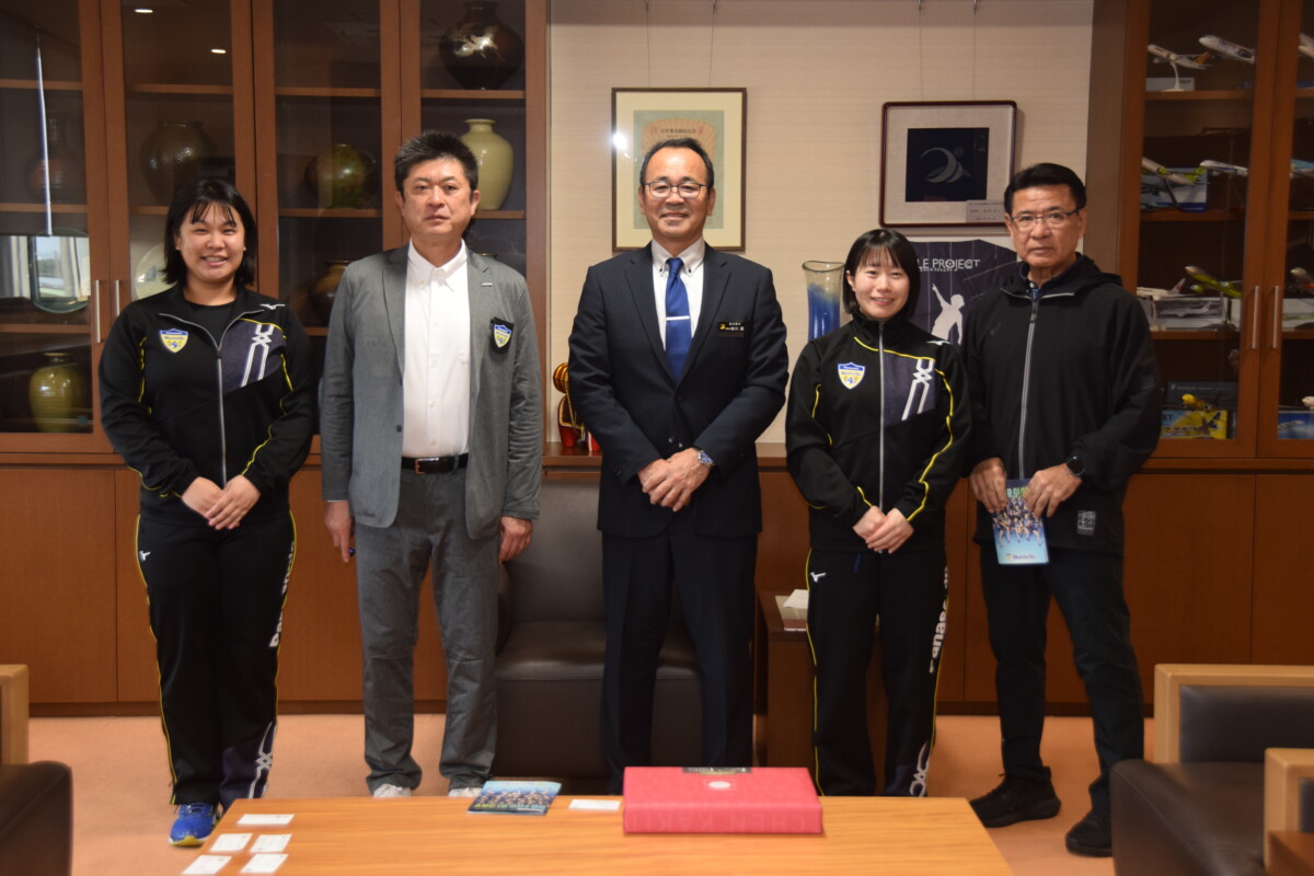 女子9人制バレーボールのトップリーグで11連覇を成し遂げた強豪、パナソニックブルーベルズの佐々木厚監督らが12日、合宿のため来島し、市役所に嘉数登市長を表敬訪問した。一行は4泊5日の日程で滞在し、きめ細かな砂浜でのトレーニングや地元の小中学生を対象としたバレーボール教室などを通じて、市民との交流と心身の鍛錬を図る。