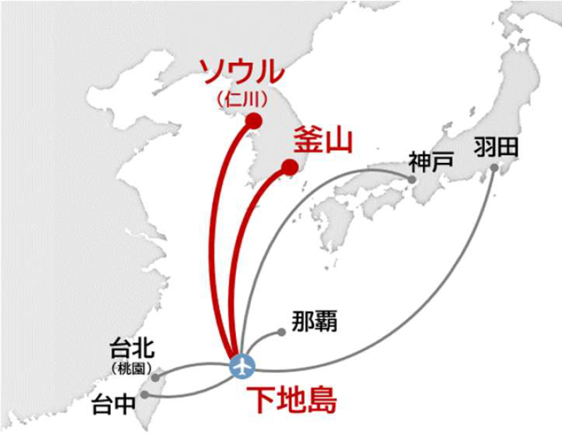 釜山線は木曜と日曜の週2回運航。下地島を午後6時に出発し、午後8時20分に釜山へ到着するスケジュールとなっている。一方、毎日運航となるソウル線は午前11時に下地島へ到着し、正午にソウルへ向けて出発する。