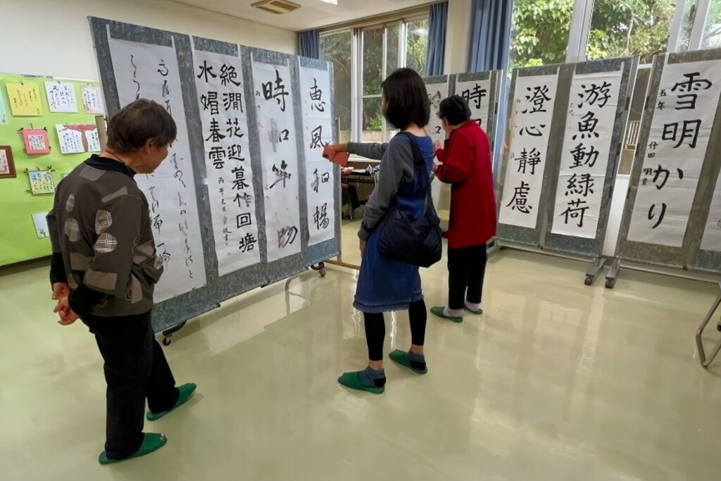 展示の部では、書道や短歌、パッチワーク、苧麻(ブー)績みなどの作品が並んだ。また、廊下には登録サークルの活動内容やメッセージが掲示されたほか、男女共同参画事業や「ゆいみな講座」の紹介コーナーも設けられ、多くの市民が熱心に見入っていた。
