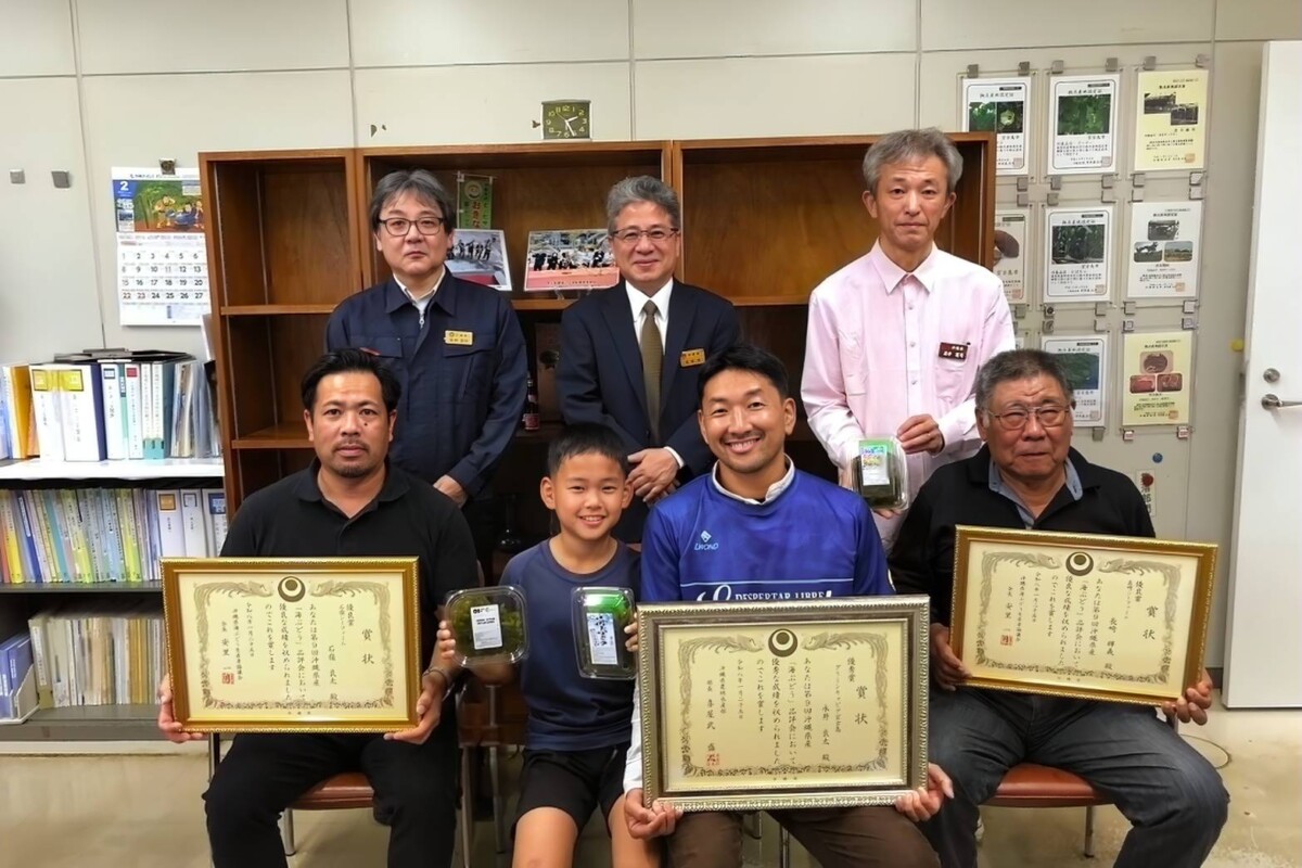令和7(2025)年度沖縄県産「海ぶどう」品評会の受賞報告会が16日、県宮古合同庁舎内の宮古農林水産振興センターで行われた。宮古島からは、最高賞に次ぐ優秀賞に永井良太さん(グリーンキャビア宮古島)、優良賞に石嶺良太さん(石嶺シーファーム)と長崎輝義さん(長崎シーファーム)の計3人が入賞。同センターの金城靖所長に喜びの報告を行うとともに、産地のさらなる発展を誓った。