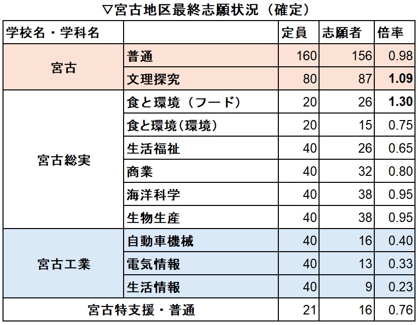 宮古高校は、普通科の定員160人に対し156人が志願し、倍率は0.975倍。対して文理探究科は定員80人に対し87人が志願し、1.0875倍と定員を上回った。学校全体の倍率は1.0125倍となっている。