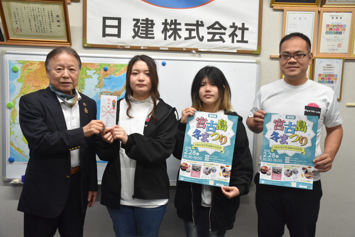 日建(川満和彦社長)は18日、今月28日に開催される「第5回宮古島冬まつり」の実行委員会(根間玄隆委員長)に対し、活動を支援する寄付金を贈った。同社は第1回大会から継続して支援を行っており、贈呈式では川満社長が実行委員の大人や学生メンバーに直接寄付金を手渡した。川満社長は「大人と学生らが一緒になり、夢と目標に向かって実現していく思いやりのスタートになる。宮古島の明るい街づくりに頑張ってほしい」と激励した。
