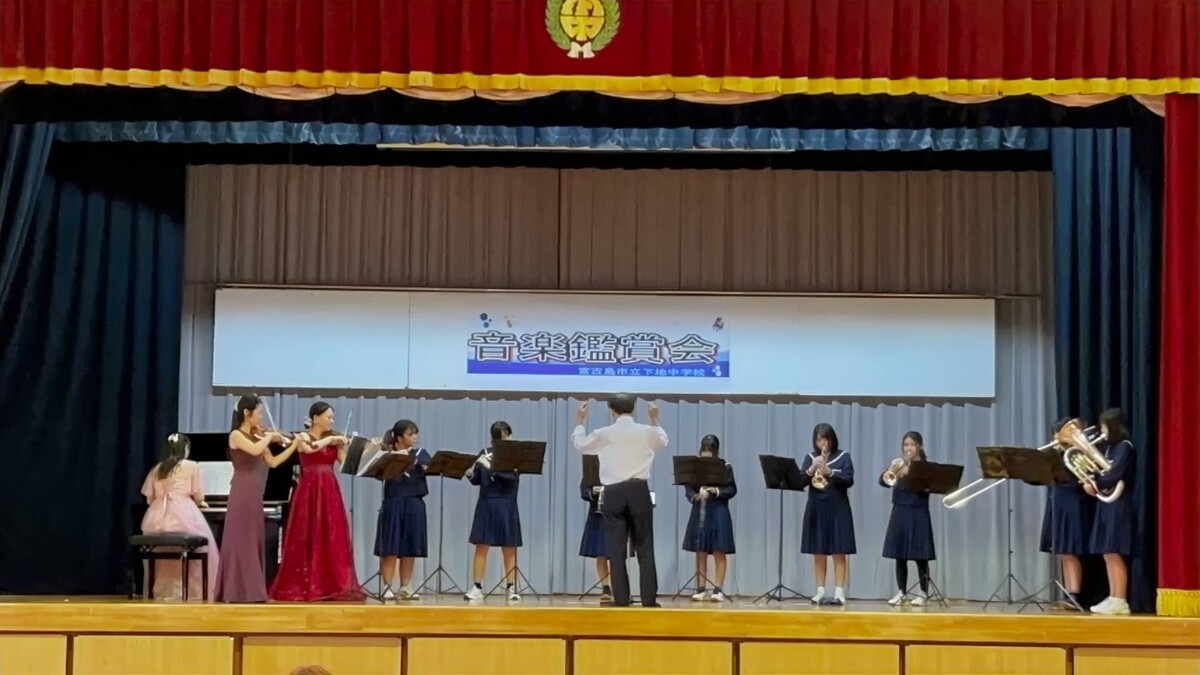 下地中学校で19日、プロの演奏家を招いた音楽鑑賞会「音楽時間~春を待つ音の重なり」が開かれた。バイオリン奏者の坂井祐美子さんが所属する「トリオミュー」を講師に迎え、全校生徒が本格的なクラシックやポップスの演奏を堪能。多感な時期に本物の芸術に触れることで豊かな情操を養うとともに、吹奏楽部との合同演奏を通じて自己肯定感を高める貴重な機会となった。生徒らは、体育館に響き渡る繊細かつ力強い音色に静かに耳を傾け、音楽が持つ力を肌で感じていた。