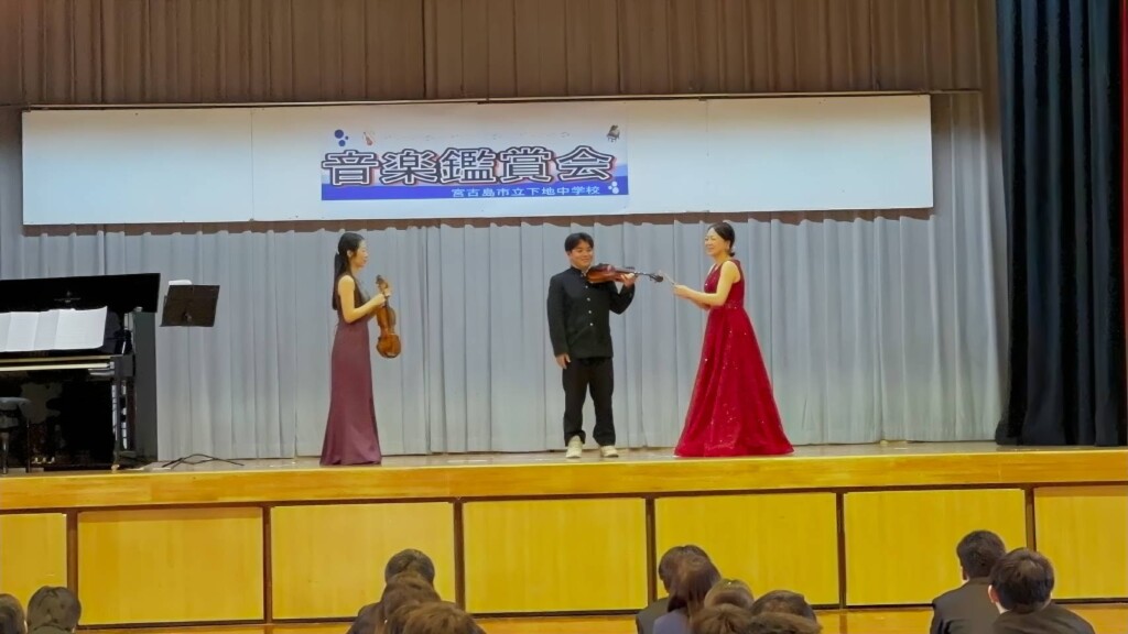 出演は坂井さん、佐竹美奈子さん(ともにバイオリン)、峠ひろみさん(ピアノ)の3人による「トリオミュー」。ステージでは「風笛」や「タイスの瞑想曲」、「情熱大陸」などアンコールを含む全8曲を披露し、中盤にはバイオリンの体験コーナーも設けられ、生徒を代表して友利進之介さんと島尻絆良さんが弦楽器の扱いに挑戦した。また、この日15歳の誕生日を迎えた砂川愛虎さんへ、サプライズで「ハッピー・バースデー・トゥ・ユー」の演奏が贈られる一幕もあり、会場は温かな拍手に包まれた。