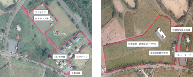 旧体験滞在交流施設は敷地面積約2万3903平方メートルと広大で、旧果樹園管理棟のほか、約2万平方メートルを超える畑地やハウス棟、旧貝殻加工施設などが含まれる。
