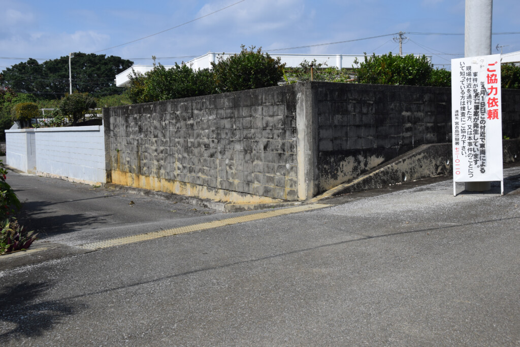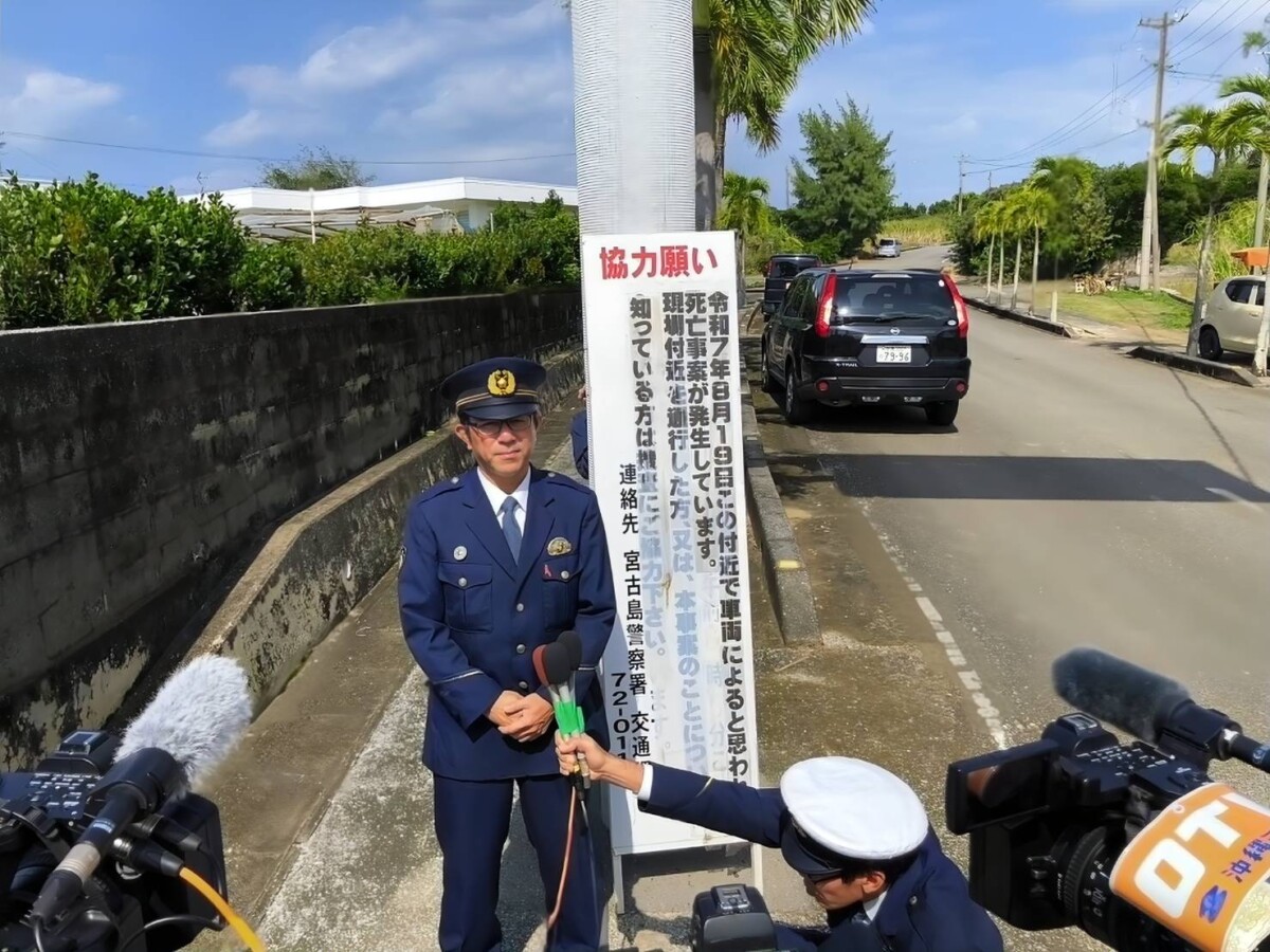 市伊良部長浜の県道で発生したひき逃げ死亡事故は19日、未解決のまま発生から半年が経過した。宮古島警察署(新垣健一郎署長)は同日、署員30人を動員し、現場付近での聞き込みや通行車両への検問、チラシ配布などの集中的な捜査活動を展開。いまだ犯人逮捕に至っていない現状を受け、同署は市民に対し些細な情報の提供を呼びかけている。冨山善裕副署長は「半年が経過し、いまだ逮捕に至っていないことに強い危機感を感じている。理不尽に命を奪われた被害者と、心に深い傷を負った遺族の気持ちを胸に刻み、必ず犯人を検挙するという強い決意を持って捜査を継続していく」と述べた。