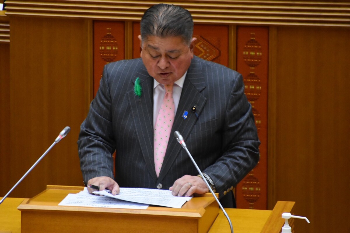 【那覇支局】県議会2月定例会は18日、那覇市の県議会議堂で開かれ、伊良部出身で浦添選挙区選出の島尻忠明議員が代表質問に立った。物価高騰対策や医療、介護体制、離島振興、国土強靭化など県民生活に直結する課題を取り上げ、県の認識と対応をただした。玉城デニー知事および関係部長ら県当局が答弁し、生活者支援や医療人材確保、防災対策の推進に取り組む姿勢を示した。