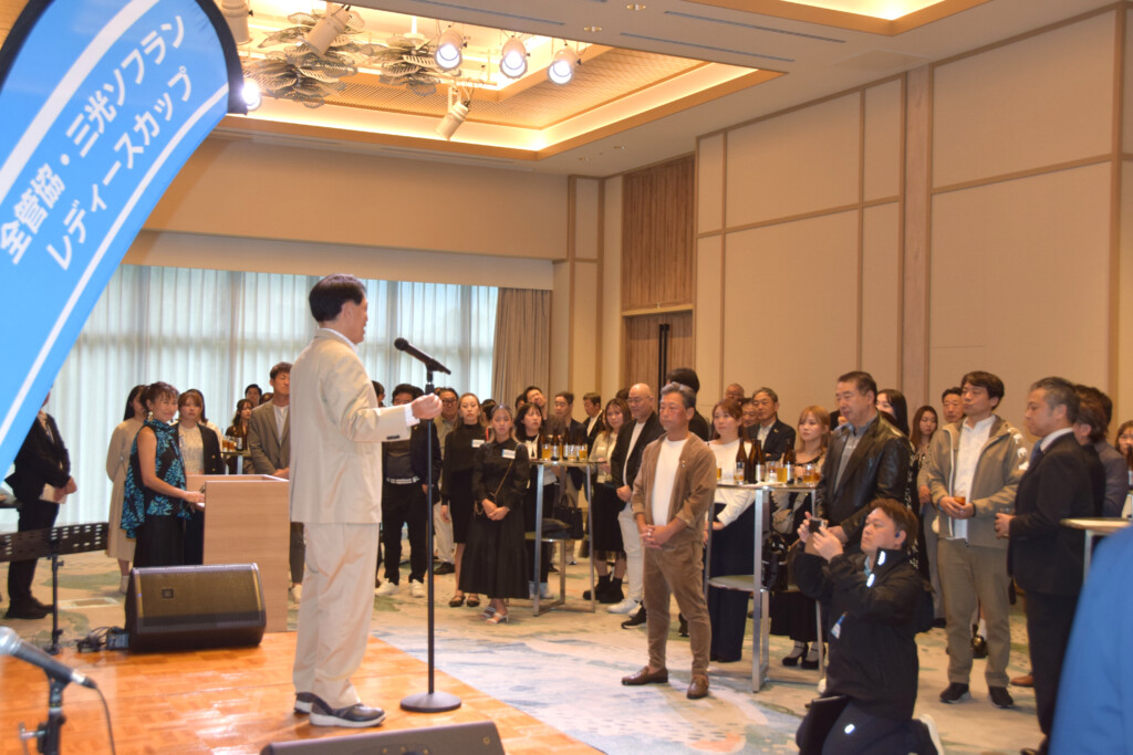 女子プロゴルフトーナメント「全管協・三光ソフランレディースカップ2026」(主催・全国賃貸管理ビジネス協会、三光ソフランホールディングス)のプロアマ大会が20日、下地与那覇のエメラルドコーストゴルフリンクスと城辺保良のオーシャンリンクス宮古島の2会場で開催された。青空の下、招待されたアマチュアプレーヤーが女子プロゴルファーとの交流を楽しみながら、コースに快音を響かせた。競技の結果、通算10アンダーで山口史恩プロ、井出絵愛里プロと宮崎隆志さん、平良良勝さんのチームが優勝を果たした。表彰式では、主催者を代表して全管協の水野隆司会長より目録が贈られた。きょう21日も実施される。