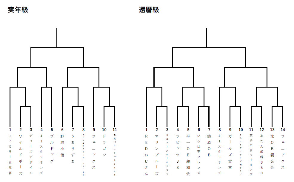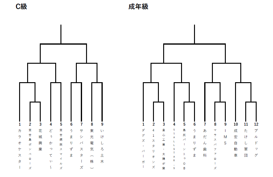 今回、同大会にはB級に16、C級に9、成年級に12、実年級に11、還暦級に14チームが登録した。