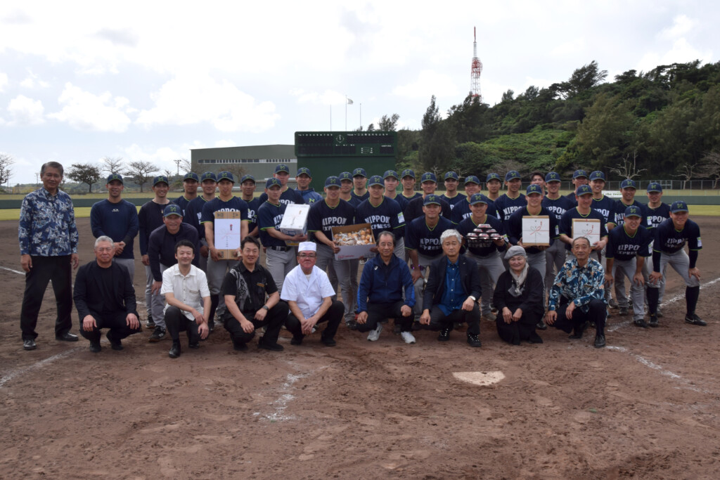 宮古島でキャンプを行っている社会人野球の強豪・日本通運野球部に対し、地元関係団体による差し入れ贈呈式が23日、市民球場で行われた。市スポーツ協会など4団体が、宮古島産のイチゴや特産のサーターアンダギーなどを贈り、過酷な練習に励む選手たちを激励し、同野球部との18年に及ぶ絆を再確認した。同野球部は今シーズンの飛躍を願った。