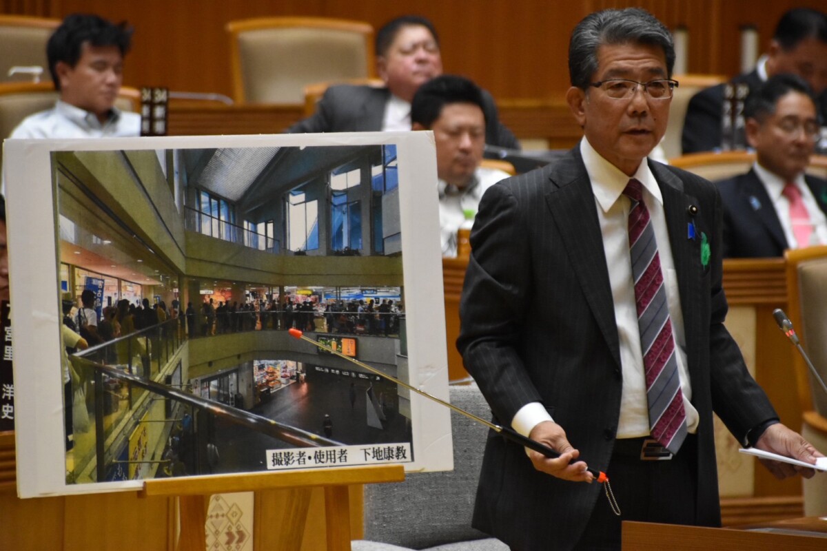 宮古空港の整備問題では、25年の利用客数が200万人を突破したことを踏まえ、保安検査混雑の解消に向けたスマートレーン整備、エプロン拡張、平行誘導路整備の進ちょくを質問した。砂川勇二土木建築部長は、観光客増加に伴い空港混雑が課題となっていると認め、航空会社と情報共有を行いながら混雑状況の調査を進めていると説明。駐車場拡張を含め、空港機能強化に向け取り組む考えを示した。