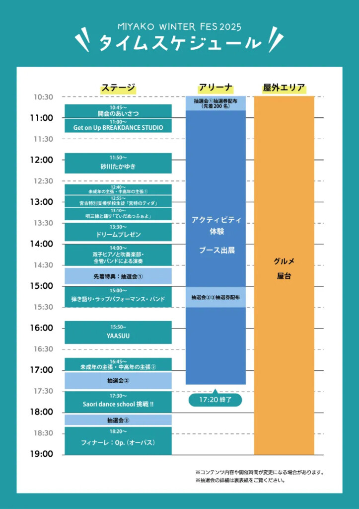 ステージでは、宮古特別支援学校生徒による「宮特のティダ」の披露(午後12時55分~)や「未成年の主張」、フィナーレを飾る高校生バンド「Op.(オーパス)」のライブ(午後6時20分~)など地元の才能が躍動する。宮古島観光大使のYAASUUも凱旋する。