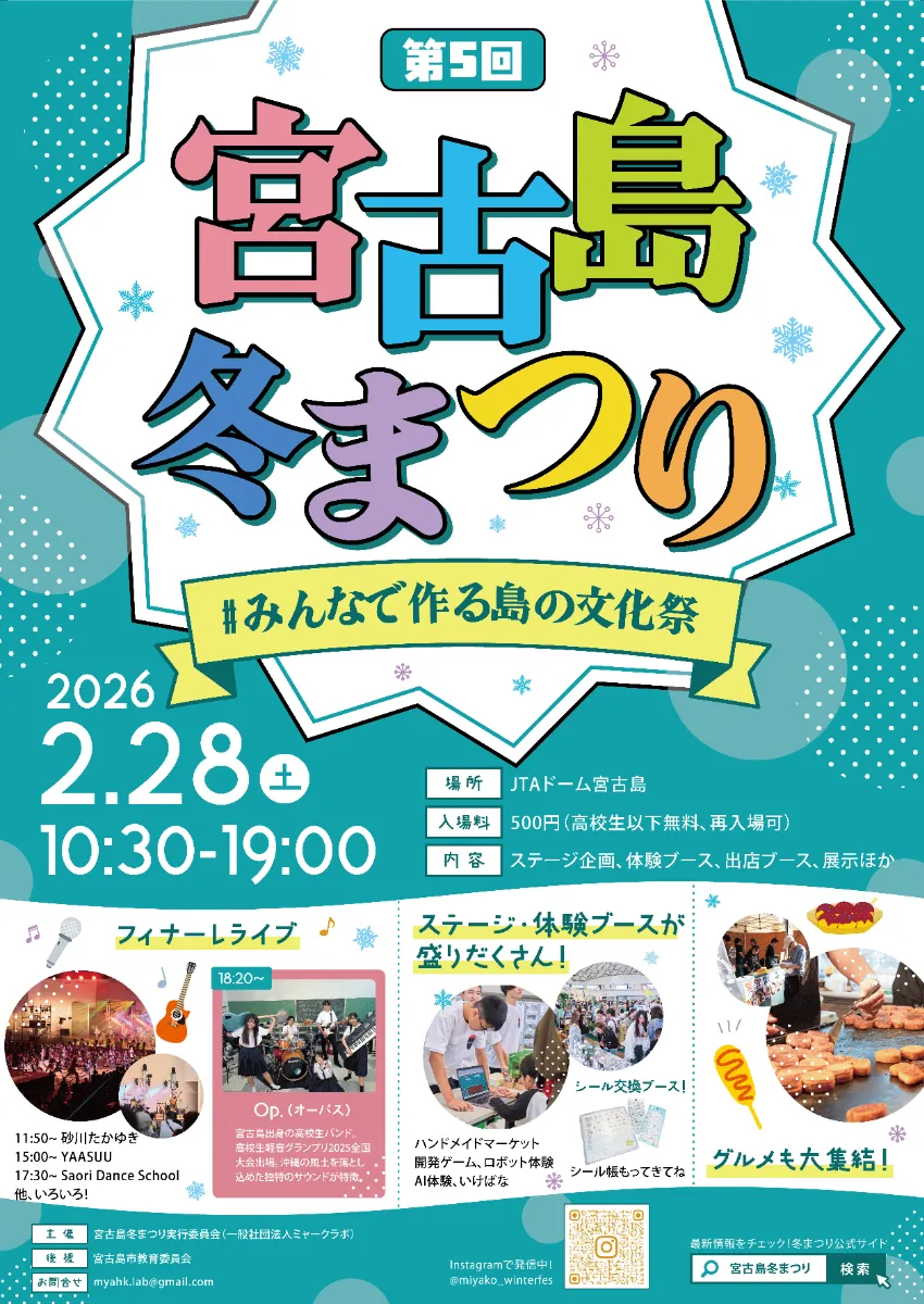 「#みんなで作る島の文化祭」をテーマに掲げた「第5回宮古島冬まつり」(同実行委員会主催)がきょう28日、JTAドーム宮古島で開催される。午前10時30分から午後7時まで。宮古島市出身の放送作家・若林凌駕さん(24)が総合司会を務めるほか、多彩なステージや体験ブースが並び、島の冬を熱く盛り上げる。入場料は500円(高校生以下は無料、再入場可)となっている。詳細は同まつりのウェブサイトに掲載。