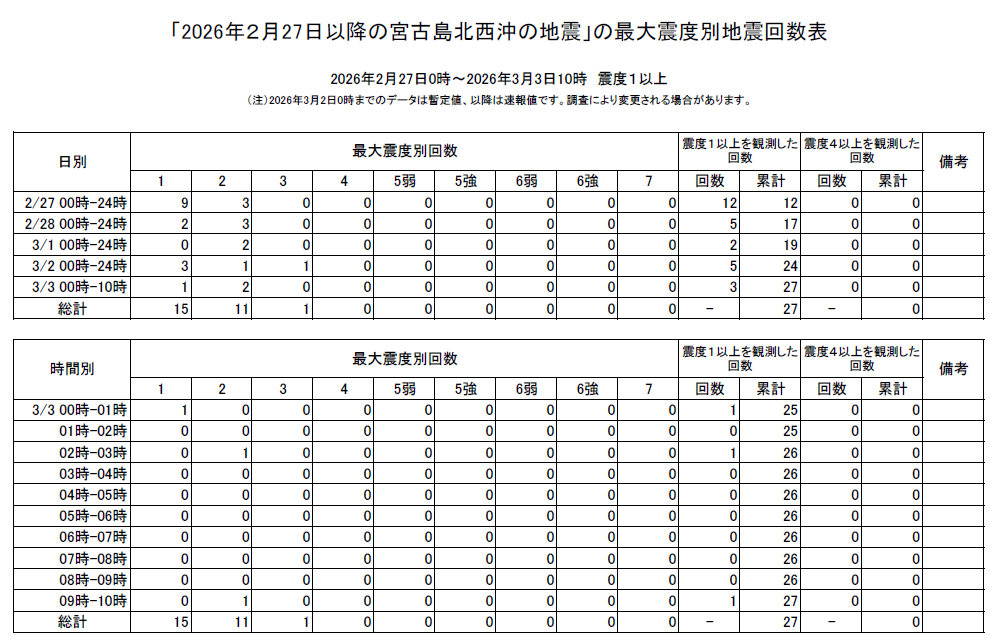 地震回数表(速報値)によると、一連の活動領域では2月27日から3月3日10時までに、震度3を1回、震度2を11回、震度1を15回観測しており、有感地震は累計で27回に達した。特に活動が目立った27日には、1日で12回の地震を観測している。