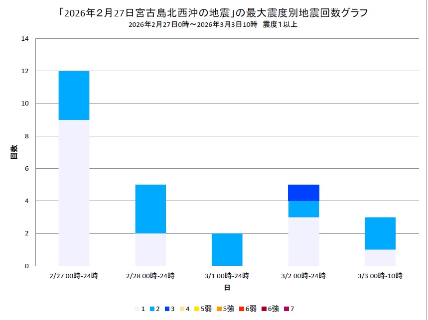 地震回数表(速報値)によると、一連の活動領域では2月27日から3月3日10時までに、震度3を1回、震度2を11回、震度1を15回観測しており、有感地震は累計で27回に達した。特に活動が目立った27日には、1日で12回の地震を観測している。