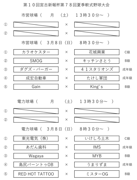 第10回宮古新報杯および第78回夏季軟式野球大会三日目が2月28日、四日目が3月1日に市営および電力球場で行われた。B級、C級、実年級の計11試合が行われ、鋭い当たりや粘り強い投球が随所に見られ、スタンドからは大きな声援が送られた。