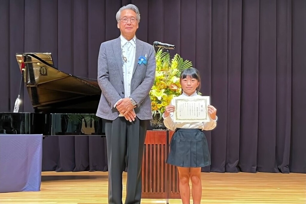 会場では、優秀賞を受賞した東文孝さん(久松小4年)、渡辺楓花さん(東小4年)、砂川愛実さん(西辺中1年)も登壇し、それぞれの視点で描いた環境への提言を披露。ゲストライブではヴァイオリニストの亀井友莉さんとピアニストの室井悠李さんが共演し、美しい音色で受賞を祝った。