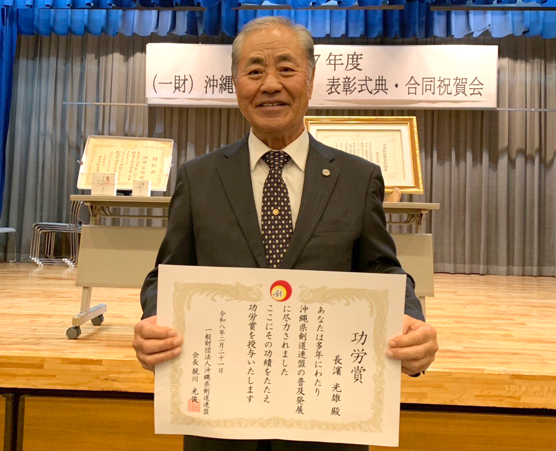 (一財)沖縄県剣道連盟(親川光俊会長)の「令和7(2025)年度表彰式典・合同祝賀会」が先月21日、那覇市の沖縄県青年会館で開かれた。長年にわたり剣道の普及発展に貢献したとして、宮古剣道連盟顧問の長濱光雄さん(74)=平良=が、県内唯一の「沖縄県剣道連盟功労賞」を受賞した。少年剣士の指導や組織運営に携わってきた功績が評価された。会場には県内各地から関係者が集い、長濱さんの栄誉を称えるとともに、さらなる精進を誓い合った。