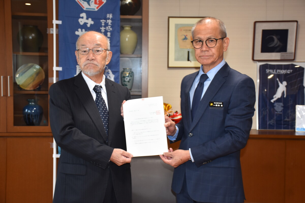 嘉数市長に陸自訓練棟新設工事などの答申を行う庄司副会長(左)