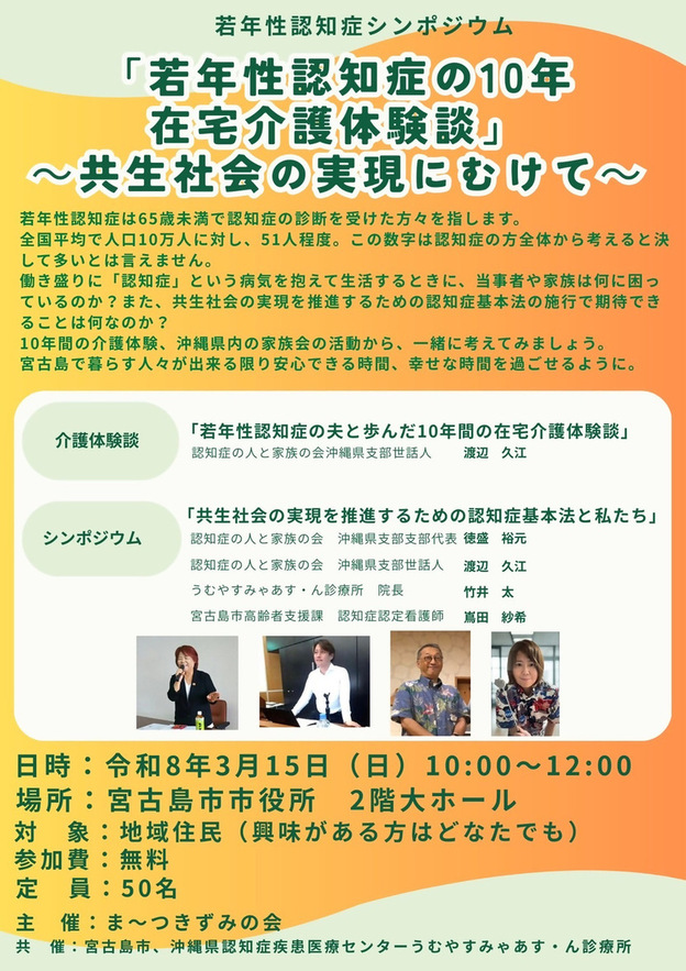 シンポジウムでは、認知症の人と家族の会の沖縄県支部世話人としても活動する渡辺さんが、家族の目線から実体験を語る。後半は、同会代表の徳盛裕元氏や同診療所の竹井太院長ら市内の専門職が登壇。介護現場や支援の最前線からの声を交え、家族が認知症になった際の心構えや、地域で活用できる支え合いの仕組みについて意見を交わす。