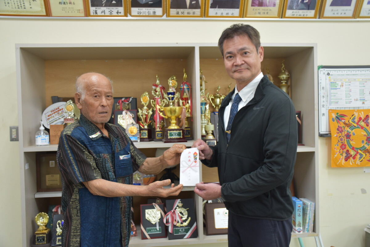 上間校長は感謝の気持ちを伝え、「友利さんは母校の子どもたちへの思いが強い。15年前にはお母さんが米寿記念で寄付しており、その意思を受け継いでいる。寄付金は子どもたちのために活用していきたい」と話した。