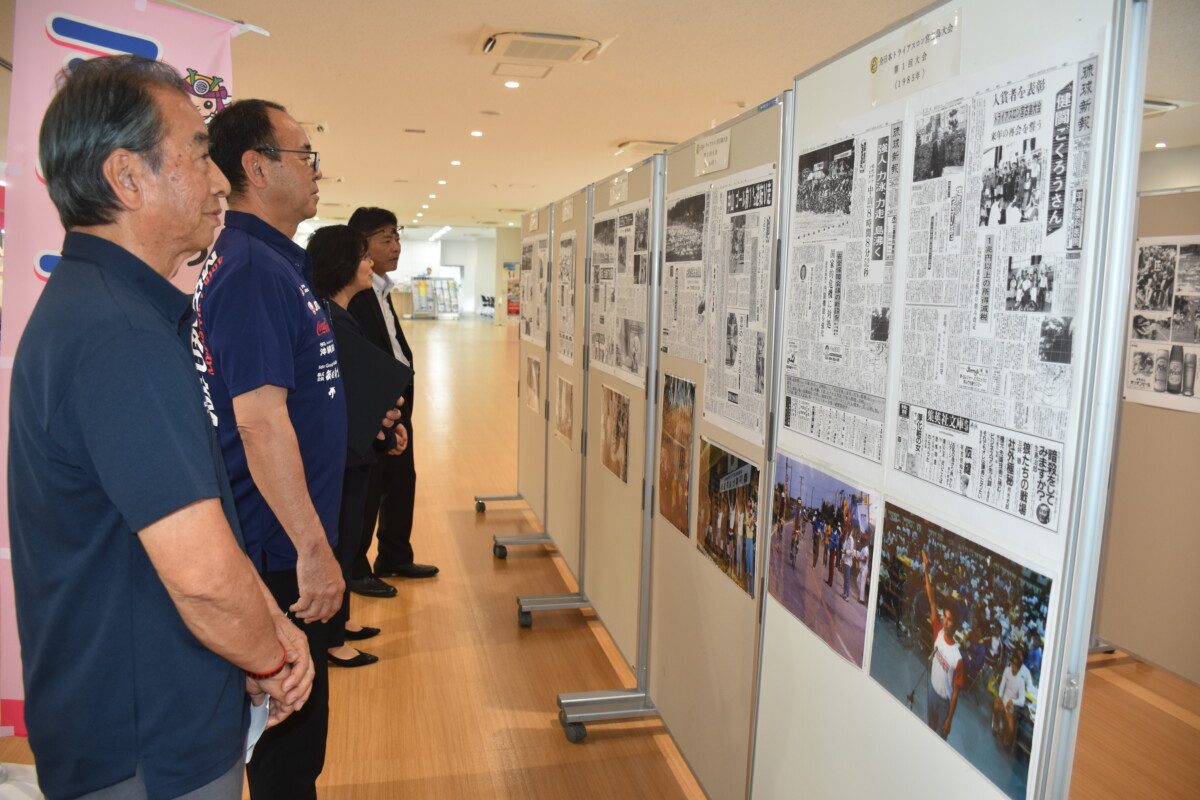 開幕にあたり大会実行委員長の砂川朗副市長が「新聞記事は当時の大会の熱気や選手たちの奮闘を伝える貴重な記録となっており、ダイジェスト映像も見ることができる。映像を通じて選手たちの努力や感動的な瞬間、宮古島全体で一つになった熱い思いを感じていただきたい」と強調した。