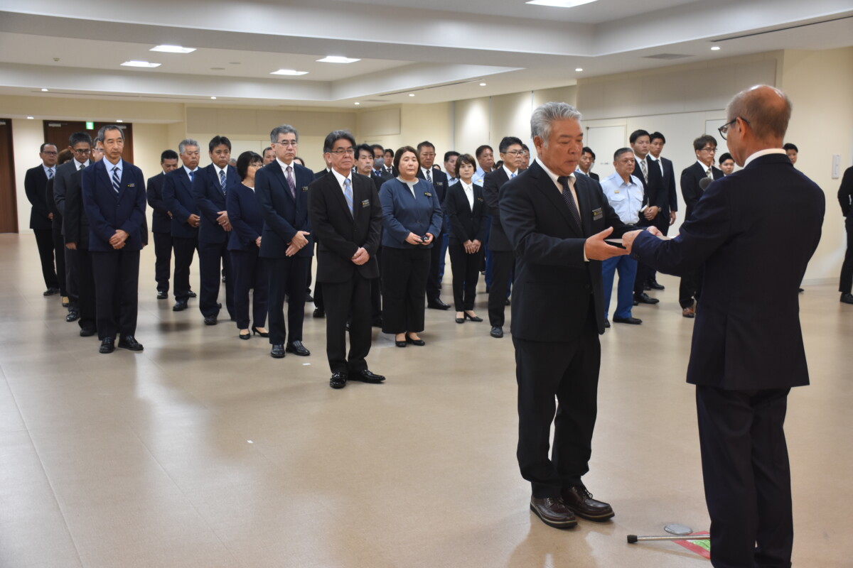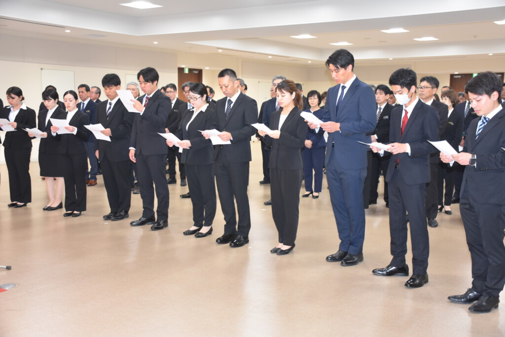 辞令交付後、市長部局と消防の新規採用職員らが宣誓書を読み上げた。市長部局の職員は「ここに主権が国民に存することを認める日本国憲法を尊重し、かつ擁護することを固く誓います。地方自治の本旨を体するとともに公務が民主的かつ効率的に運営すべき責務を深く自覚し全体の奉仕者として誠実かつ公正に職務を執行することを固く誓います」と述べた。