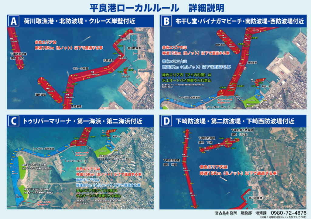 平良港のエリア内では、時速15㌔(8ノット)以下、または時速8㌔(4・3ノット)以下での通過を求めている。パイナガマビ―チは設置されたブイの内側は水上バイクなどの乗り入れを禁止にしている。
