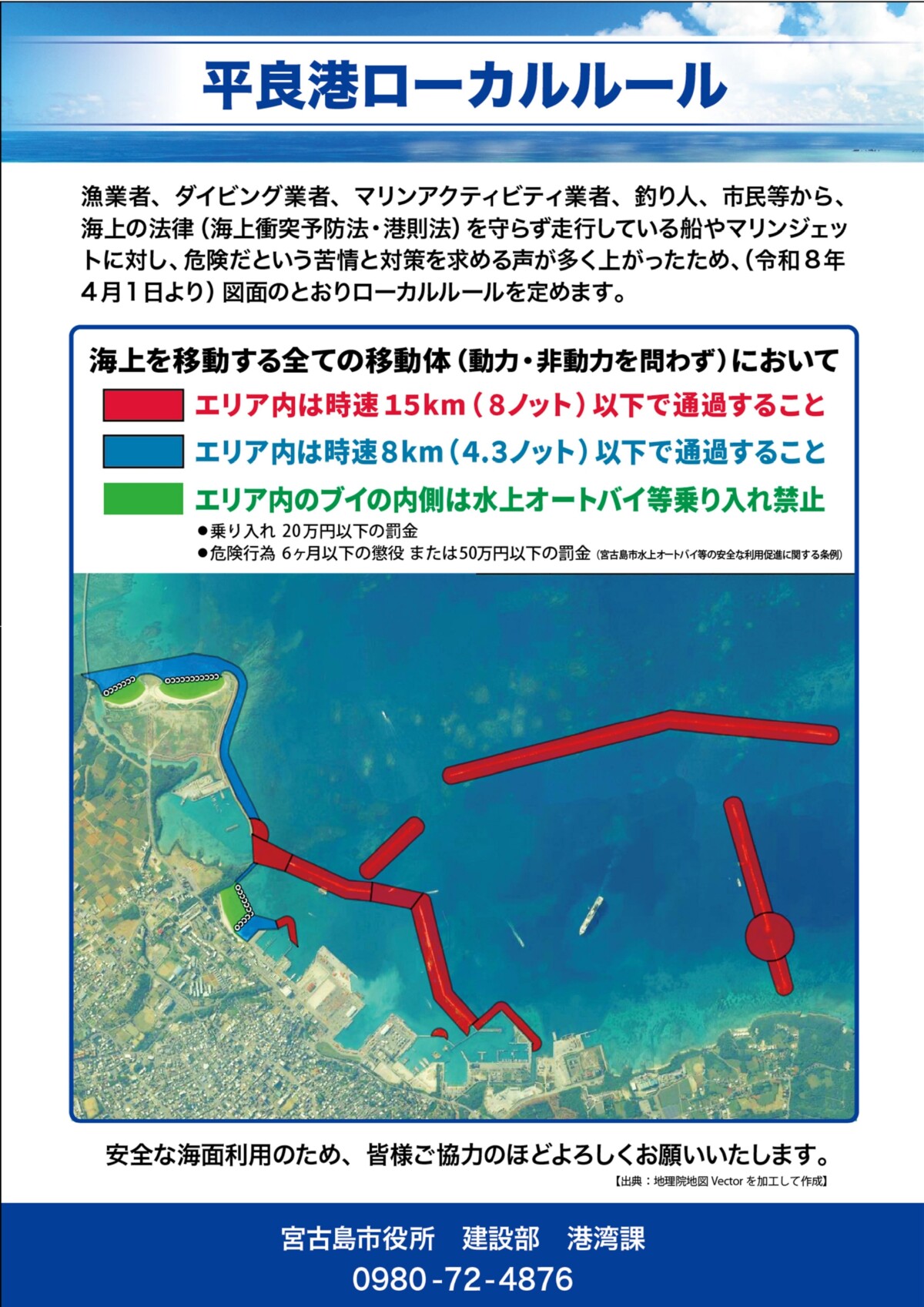 平良港のエリア内では、時速15㌔(8ノット)以下、または時速8㌔(4・3ノット)以下での通過を求めている。パイナガマビ―チは設置されたブイの内側は水上バイクなどの乗り入れを禁止にしている。