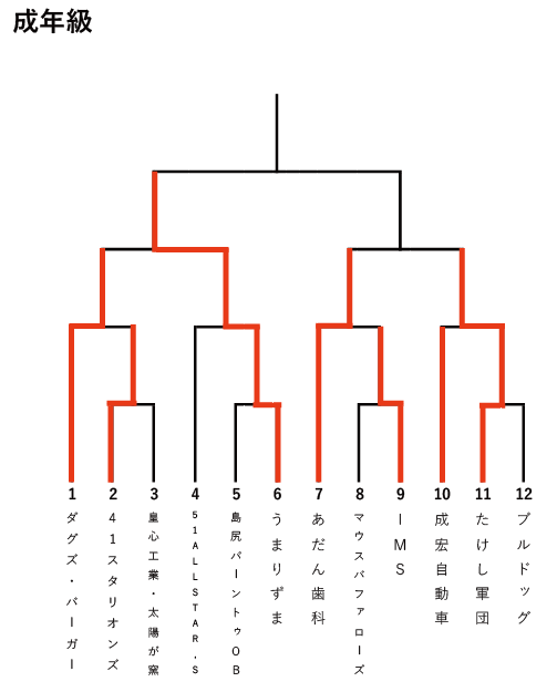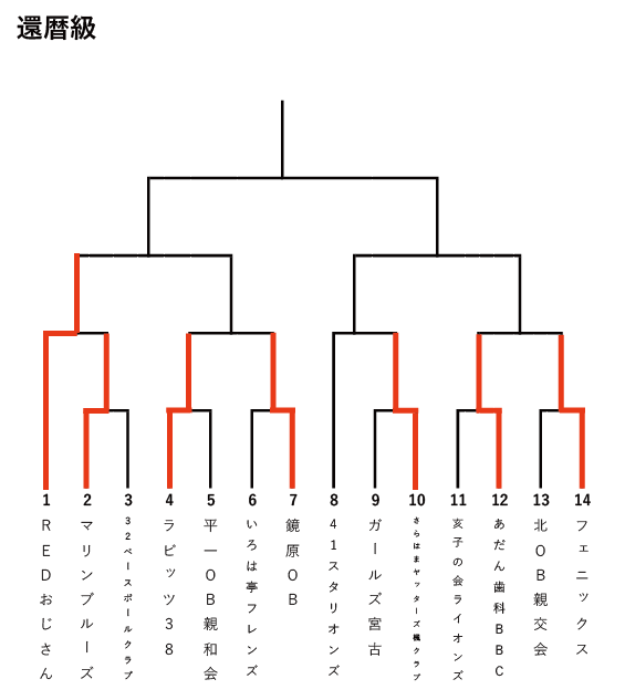 還暦級では、あだん歯科BBCが大差で亥子の会ライオンズに勝利。REDおじさんは川田の本塁打などでマリンブルーズをコールドで下した。フェニックスは不戦勝となった。