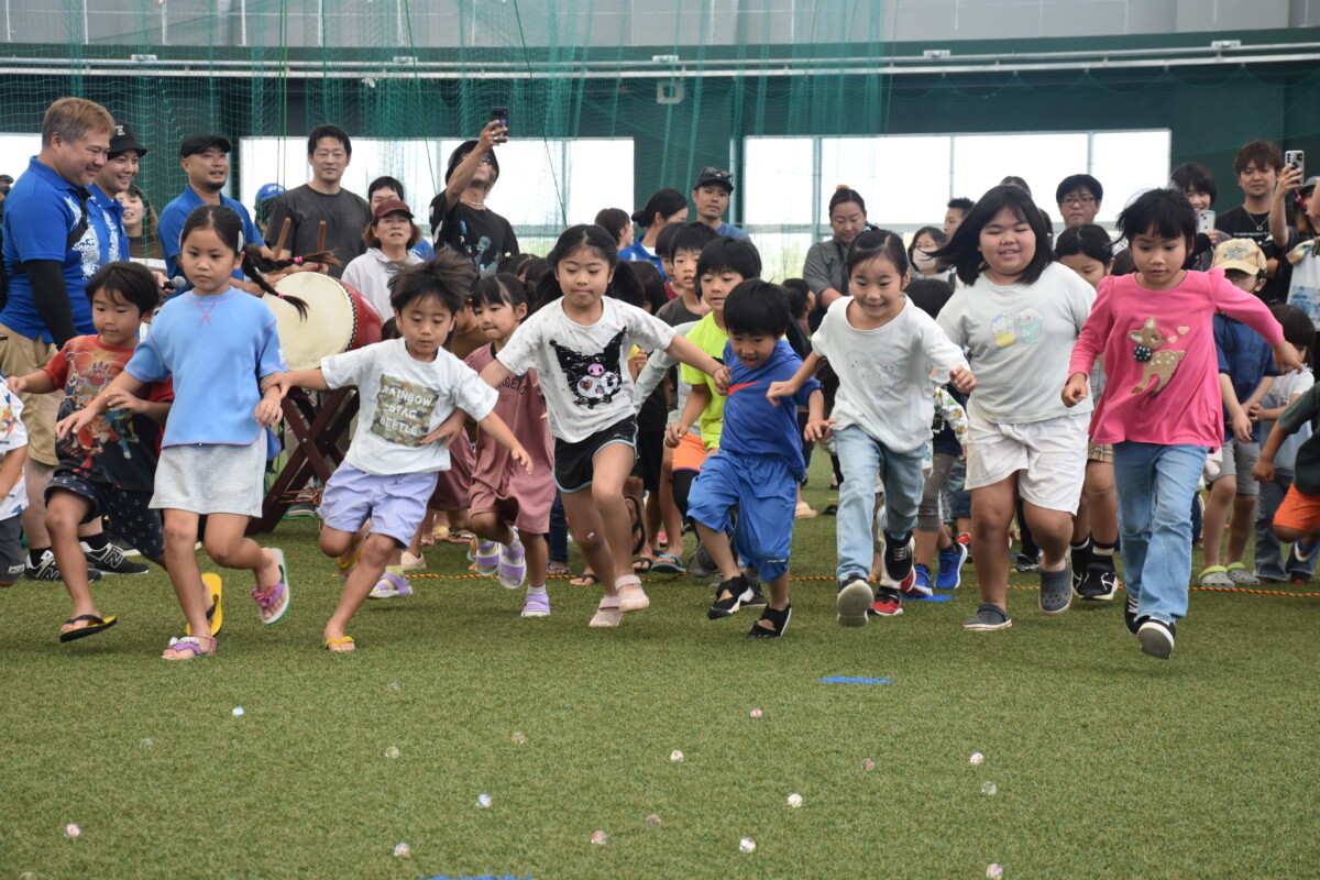 2026年海族まつり「第48回サンゴの楽園未来まで集まれ、遊ぼう宮古島の海びらき」(宮古島観光協会主催)の関連イベントが5日、伊良部屋外運動施設多目的屋内運動場で行われた。この日、下地与那覇の前浜ビーチで開催の「宮古島の海びらき」は悪天候が予想されるとして中止になり、一部プログラムを変更して関連イベントを実施。多くの子どもらが宝さがし、島ぞうりとばしなどを楽しんだ。