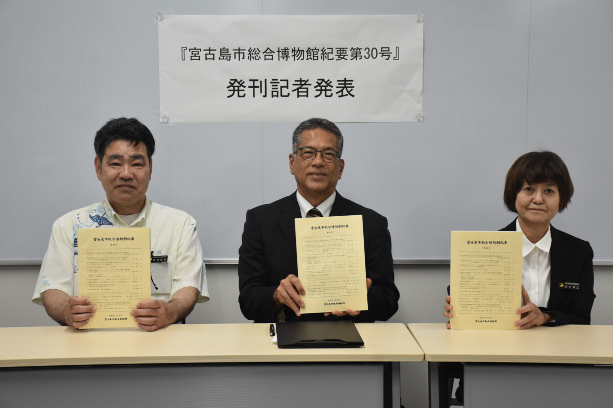 宮古島市教育委員会の宮城克典教育長らが10日、市役所で会見し、「宮古島市総合博物館紀要第30号」を発刊したと発表した。研究者や学芸員ら15人が執筆し、自然や民俗、歴史など多岐にわたる最新の研究成果を240ページに凝縮。宮城教育長は「執筆者の分野はさまざまで自然分野だけでも植物、鳥類、昆虫類などと幅広い。方言、祭祀行事の記録、宮古の自然、歴史、民俗研究の最新の情報が盛り込められた貴重な一冊となっている。市民をはじめ島内外の皆さんにも活用していただきたい」と呼び掛けた。