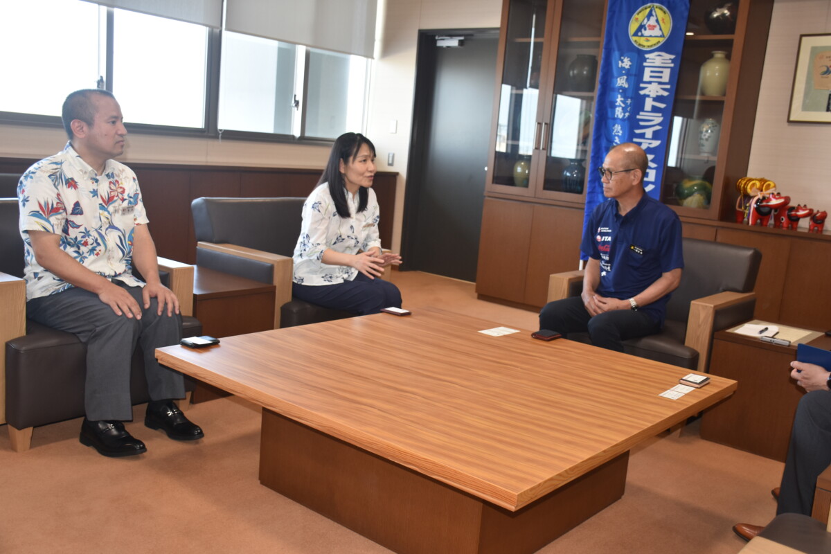 懇談で嘉数市長は、19日に開催する第40回全日本トライアスロン宮古島大会も紹介し、「今回は外国からの78人を含めて1469人が出場する。市民などボランティア、企業の支援で行っており、40回の記念大会ということでしっかり安全な大会にしていきたい」と述べた。