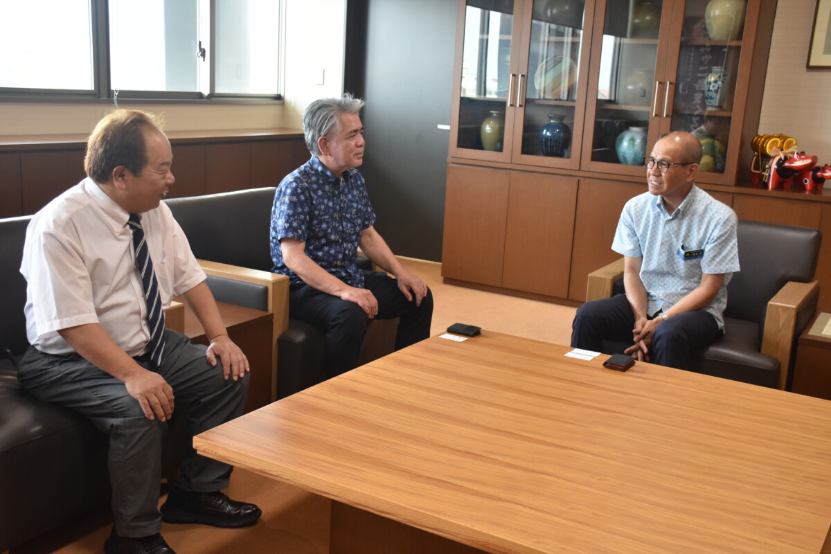 嘉数市長を訪問した顧所長(中央)、高橋次長(左) =15日、市役所・市長応接室