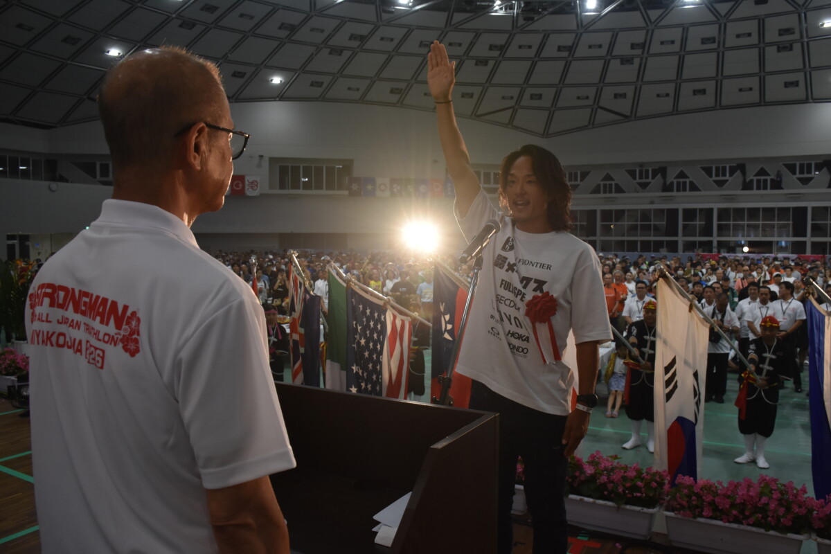 前回総合優勝の古谷選手が優勝杯などを返還。嘉数市長は「1985年に始まったトライアスロン大会は歴史を紡ぎ、今年で記念すべき40回目を迎えた。今年は14地域の海外勢を含め全国から1469人の屈強なアスリートが集結し熱い戦いが繰り広げられることを期待している。宮古ブルーの海に抱かれ、宮古島の風を受け、宮古島の太陽(てぃだ)を見ながら心身の限界に挑むストロングマンにふさわしい舞台。練習の成果を発揮していただきたい」とあいさつした。