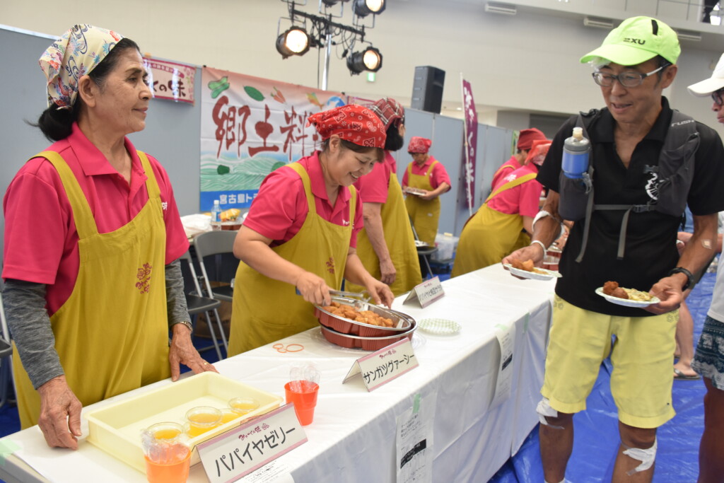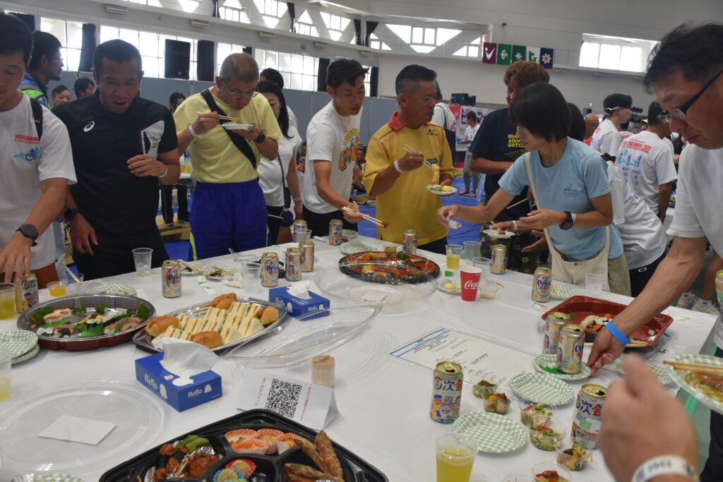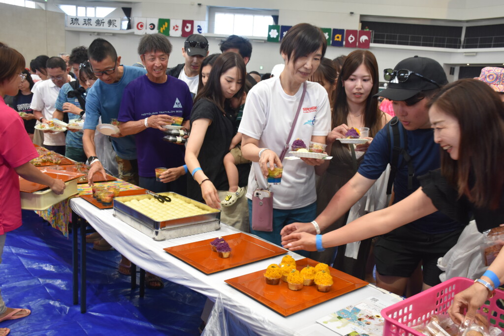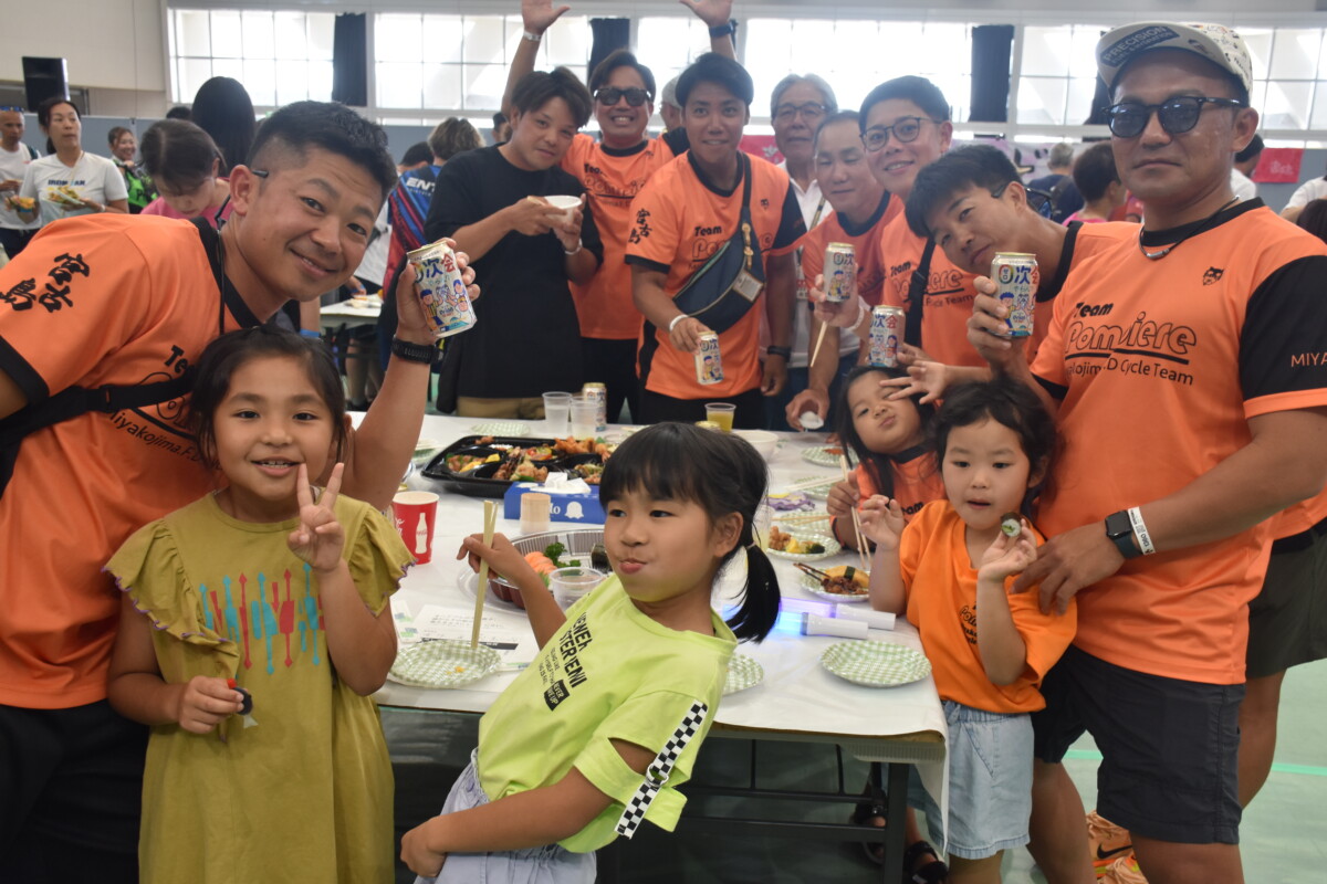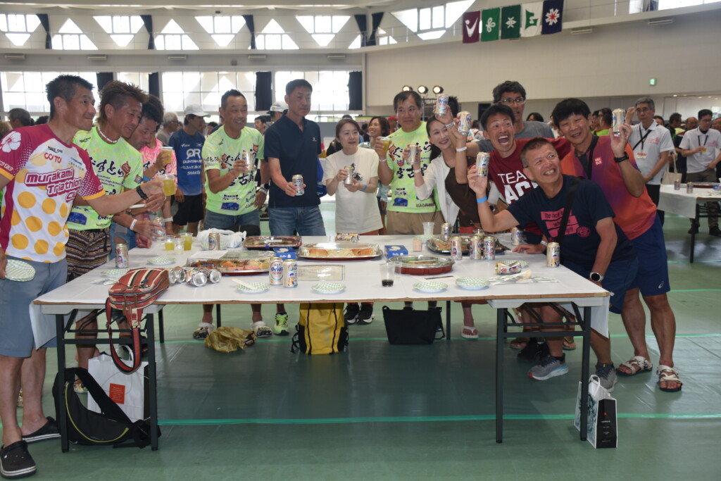 第40回全日本トライアスロン宮古島大会の「表彰式、ふれあいパーティー」が20日、JTAドーム宮古島で行われた。会場の各テーブルには寿司やオードブルなどが並び、みゃーくの味加工推進協議会の郷土料理、地元飲食店の宮古そばなども振る舞われた。舞台では歌や演奏のアトラクションもあり、スイム、バイク、ランの競技に挑んだ多くの選手たちが疲れも見せずに笑顔で乾杯し、交流を深めながら互いの健闘をたたえ合い次大会での再会を誓った。会場は終始和やかな雰囲気に包まれた。