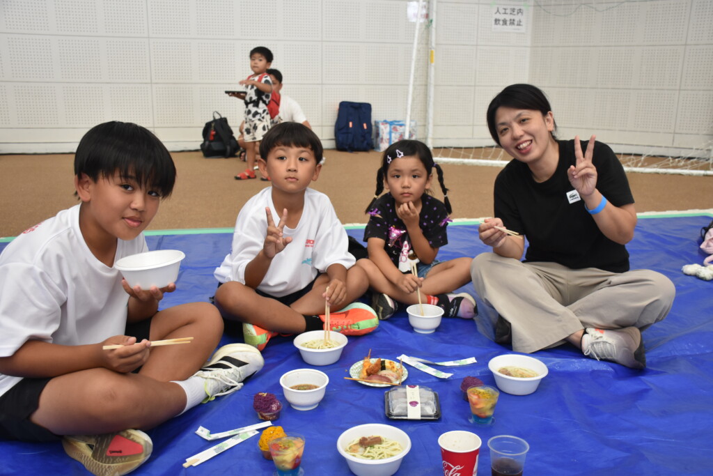 子どもも囲みながら笑顔の地元選手ら
