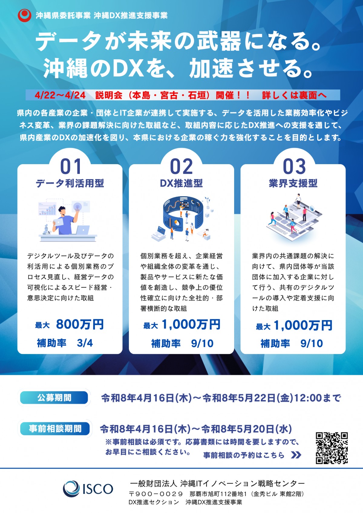 一般財団法人沖縄ITイノベーション戦略センター(ISCO)は、令和8(2026)年度「沖縄DX推進支援補助金」の公募開始に伴い、あす23日午後2時から宮古島市未来創造センターで公募説明会を開催する。県内産業のデジタルトランスフォーメーション(DX)を加速させ、企業の「稼ぐ力」を強化することが狙い。説明会の申し込みはコチラから。
