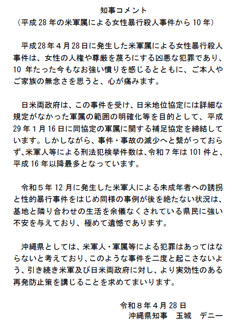 【知事コメント】平成28年の米軍属による女性暴行殺人事件から10年 2026.04.28 9 views Tweet Share Hatena Pocket RSS feedly Pin it Tweet Share Hatena Pocket RSS feedly Pin it 社会・一般 ホルムズ海峡の通航の安全確保は日本自身の問題 德地秀士 ICTで地域課題解決へ 総務省、アドバイザー派遣受付開始 専... 関連記事一覧 「寒緋桜」咲き始める 来月上旬には満開 2022.01.16 「大腸がんゼロへ検診を」 早期発見・早期治療重要 ... 2026.01.17 初の運動参観イベント開催 クララこども園 2022.11.20 官民連携で市民の「稼ぐ力」を 市民所得向上懇話会開催 2023.11.14 ユイマール心広げよう 赤い羽根運動 伝達式と募金活... 2025.10.01 池間島大演芸会を開催 150人の住民ら盛況 2024.09.28 島内発電で全電力供給 来間島MG訓練成功 2022.08.21 平和願い慰霊の塔に合掌 伊良部地区遺族会が戦没者追悼式 2024.06.25
