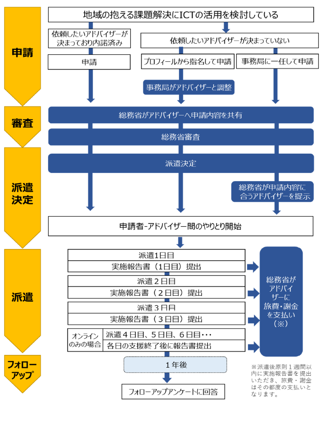 申請:地域の課題解決に向け、ICT活用の助言を求める団体が事務局へ申請。