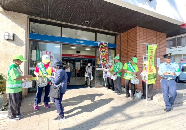 年金支給日と全国地域安全運動(11~20日)に合わせ、宮古島警察署と宮古島地区防犯協会は15日、琉球銀行宮古支店前で特殊詐欺被害防止を呼びかける広報啓発活動を行った。