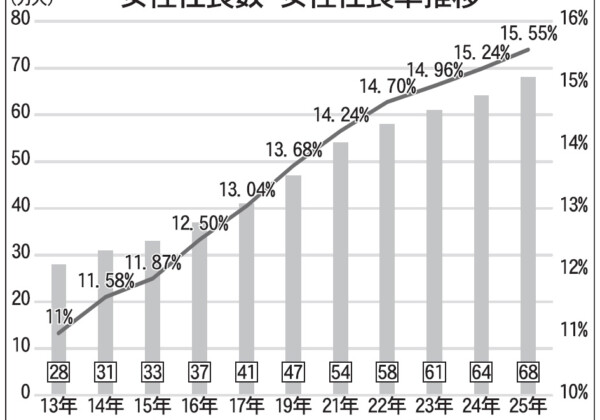 東京商工リサーチが27日発表した「第14回全国女性社長調査」によると、2025年時点で全国の女性社長数は68万4669人となり、前年より3万5407人(5・4%)増加し、女性社長率(全企業に占める割合)は15・55%と過去最高を更新したという。