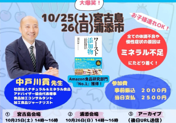食品添加物や農薬、水質汚染など現代の食を取り巻く課題をテーマにした講演会「ぬち(命)を守る食と水の真実」と題した講演会(同講演会事務局主催)が25日、下地上地のICT交流センター(旧下地庁舎)で開催される。