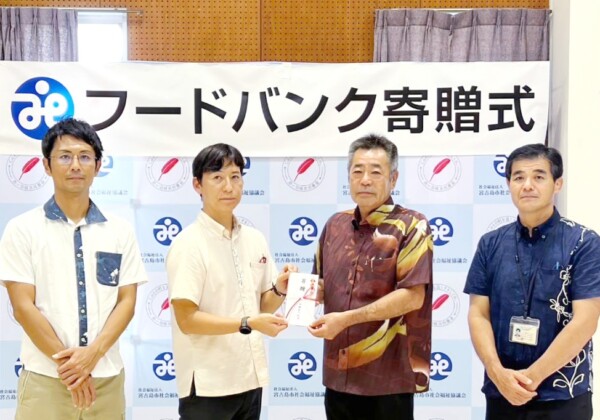 沖縄電力関連産業労働組合連合(沖縄電力総連)は2日、平良老人福祉センターで市社会福祉協議会への寄付金を贈呈した。