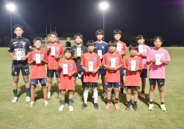 宮古サッカー協会(饒平名正会長)は1日、前福多目的運動場で県トレセンに選出された市内の小中学生13人に激励金を贈呈した。